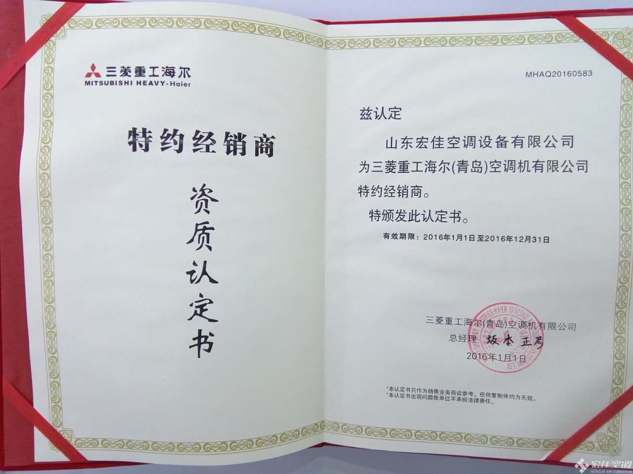 三菱重工海爾 特約經(jīng)銷商資質(zhì)認證書特約經(jīng)銷商資質(zhì)認證書
