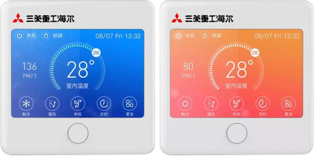 隨著控制模式的不同,i-C彩智控制器的顯示屏界面色調(diào)可以做出多彩的變化:制冷時(shí)為藍(lán)色,冷色調(diào)給人更加清爽的感覺;制熱時(shí)為橙色,暖色調(diào)為家居倍添溫暖。