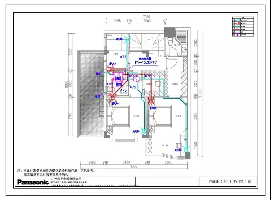 使用了PM2.5家用薄型全熱交換器,3送風3回風,新風主機設置在衛(wèi)生間,分歧箱設置在衛(wèi)生間門前的過道頂上。