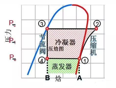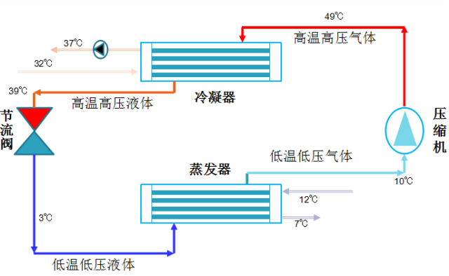低溫低壓的制冷劑蒸汽被吸入壓縮機(jī),通過壓縮機(jī)進(jìn)行壓縮,變成高溫高壓的制冷劑蒸汽被輸送到冷凝器,通過冷凝器進(jìn)行冷凝(放熱),變成高溫高壓的制冷劑液體(熱量通過載熱劑進(jìn)行釋放)。高溫高壓的制冷劑液體在通過節(jié)流閥(膨脹閥)降壓后,變?yōu)榈蜏氐蛪旱闹评鋭┮后w進(jìn)入蒸發(fā)器,通過蒸發(fā)器進(jìn)行蒸發(fā)(吸熱),變?yōu)榈蜏氐蛪旱闹评鋭怏w(冷量通過載冷劑進(jìn)行能量釋放),進(jìn)行再次制冷循環(huán),周而復(fù)始。